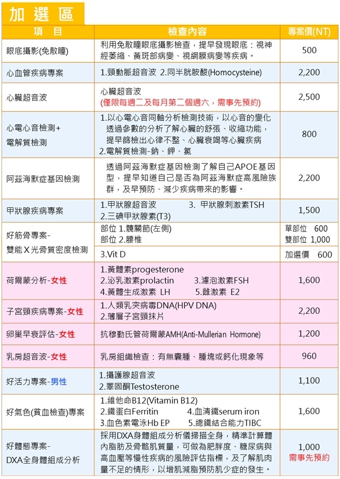 - 健康秘書:健檢報告之衛教、醫療諮詢、轉診服務。