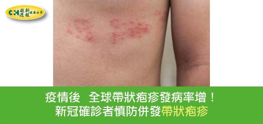 國外研究發現,染疫後的帶狀疱疹發作率,比疫情前增加35.4%;且不像昔日只出現在老人、慢性病患或免疫低下者身上。連健康的兒童及大人,也可能因為感染新冠肺炎病毒,併發帶狀疱疹。50歲以上確診者提高15%罹患帶狀疱疹風險,且這種高風險會在確診後至少持續6個月。此外,在新冠肺炎重症患者中,罹患帶狀疱疹的機率更攀升至21%。