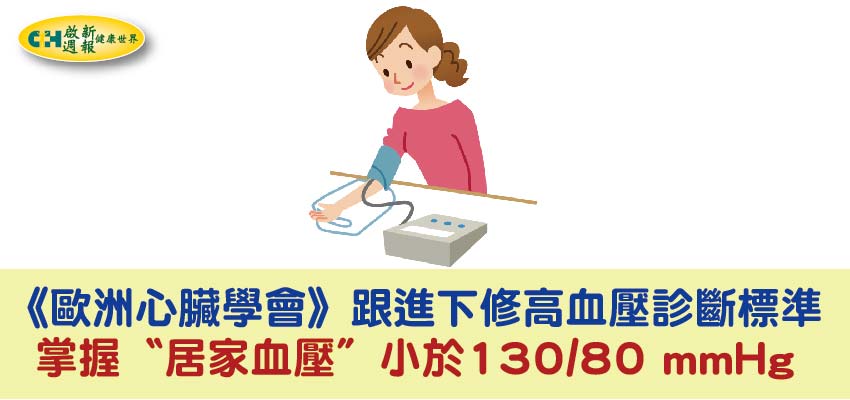 一向支持寬鬆版高血壓治療標準的歐洲心臟學會(ESC),也終於今年調整高血壓診斷標準,從140/90 mmHg下修至130/80 mmHg;並且歐洲新版治療指引也將「居家血壓」視為判定高血壓的重要參考依據,若是超過130/80 mmHg,即被認定高血壓,醫院的高血壓診斷標準,仍維持140/90 mmHg規定。
